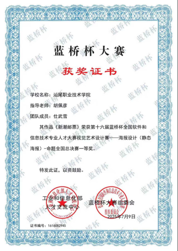 胡佩彦 | 2025年第十六届蓝桥杯全国软件和信息技术专业人才大赛视觉艺术设计赛—海报设计(静态海报)—非命题省赛一等奖(新潮邮票)(仕武雪) | 省级 | 一等奖 | 202506 |